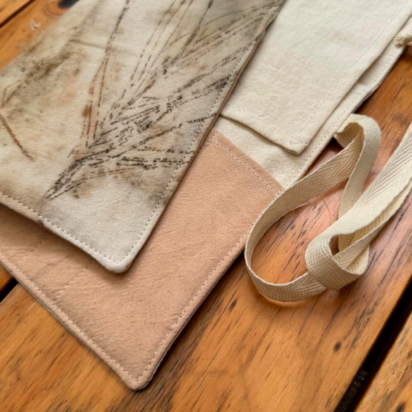 Textiles ecoprint y teñidos artesanales: cada pieza es única, con estampados de hojas y pigmentos naturales.