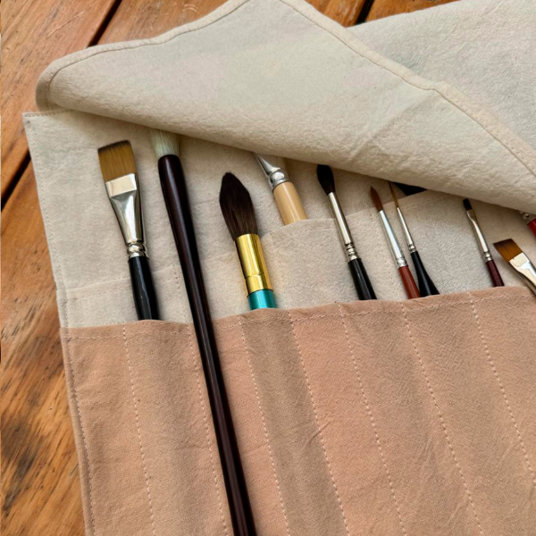 De los mismos textiles que usamos para nuestras fundas, nace un nuevo compañero, pensado para llevar tus pinceles con la misma conciencia con la que elegís cada material.